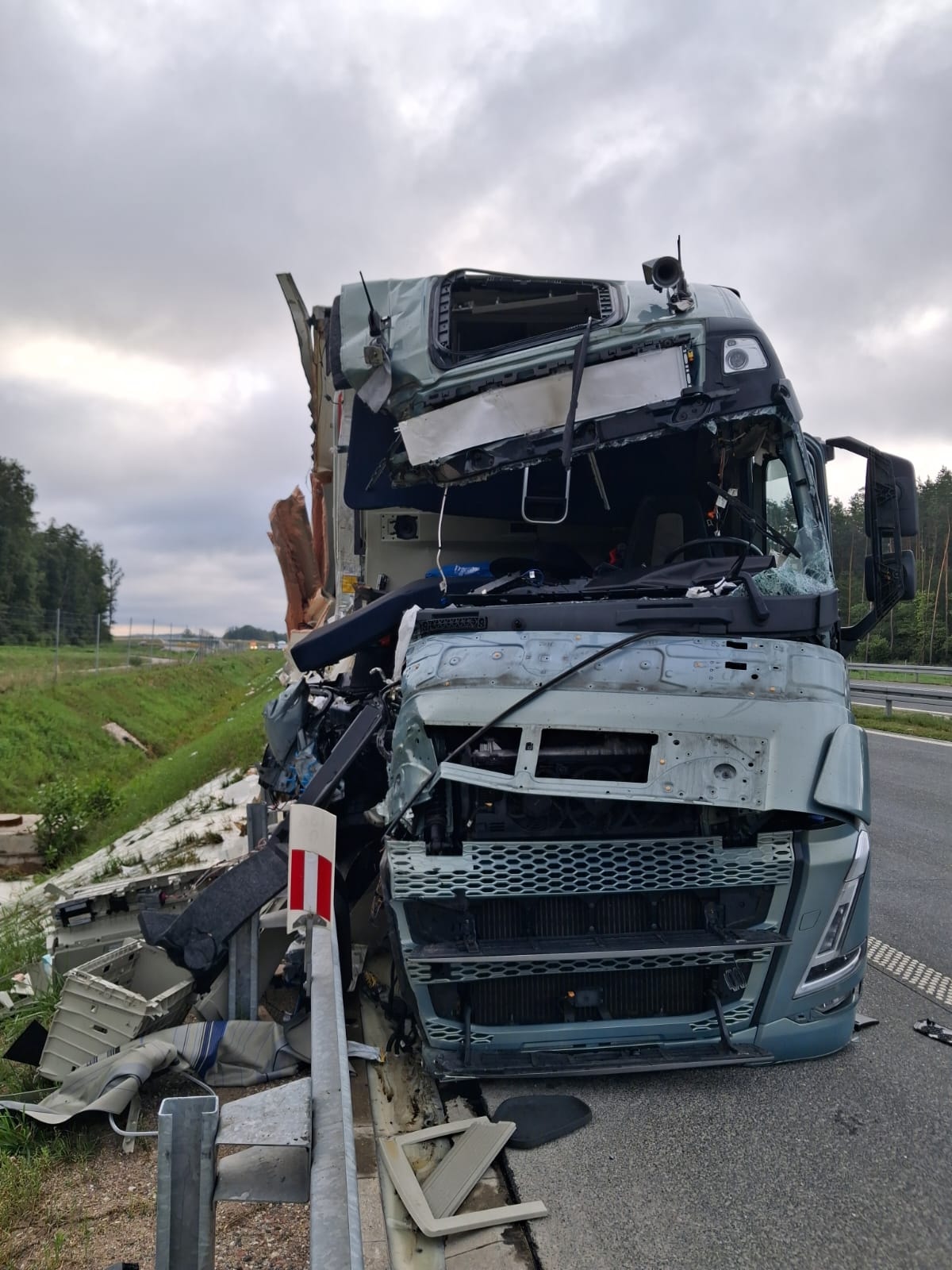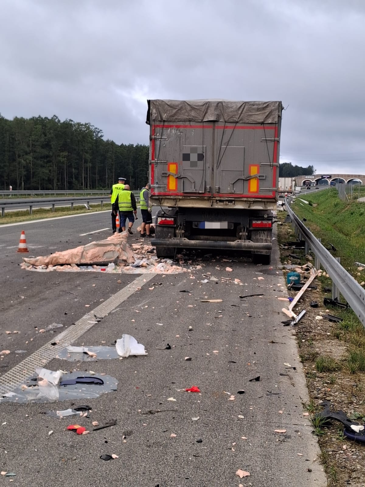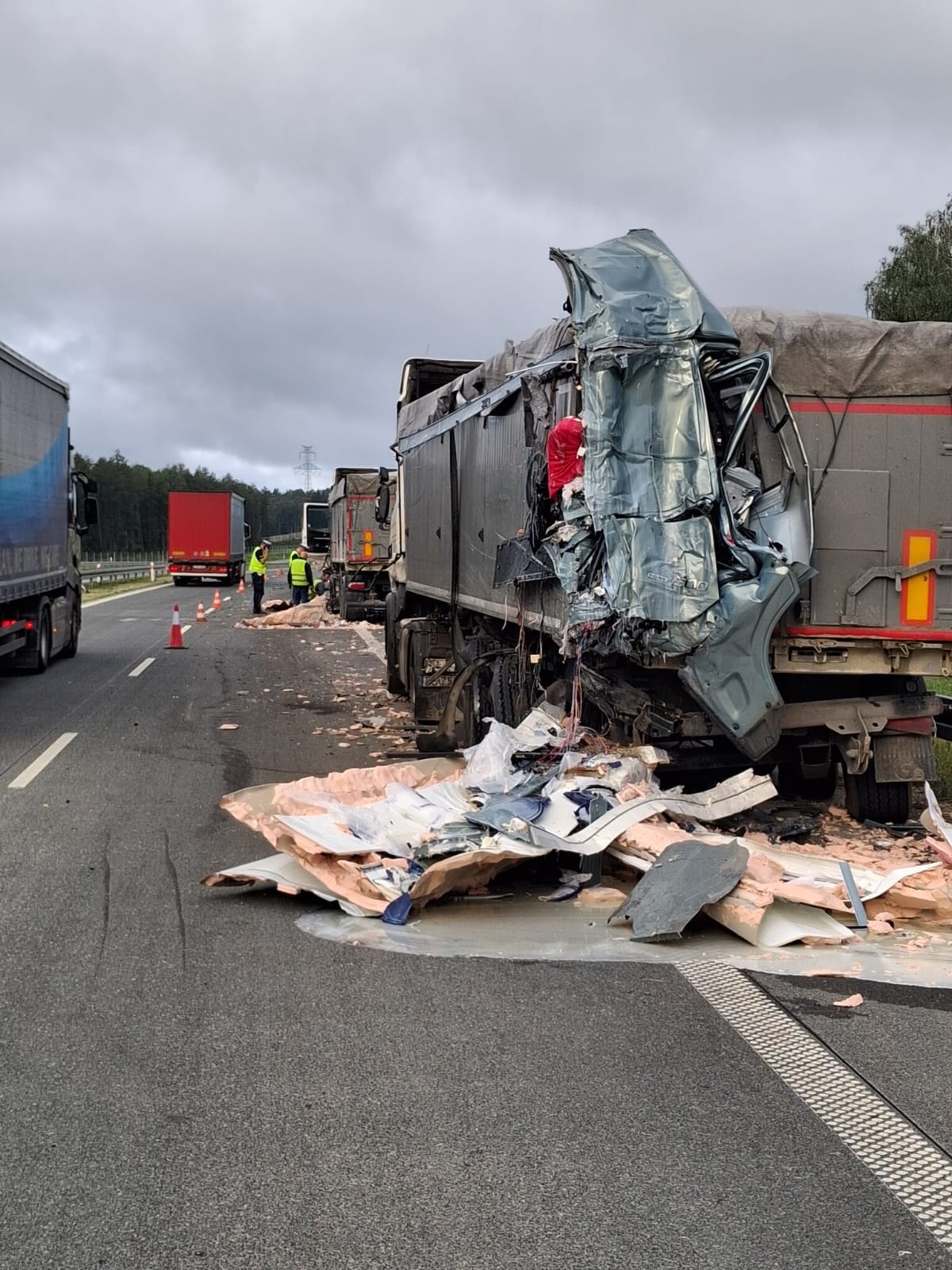 W miejscu zdarzenia wciąż z użytkowania wyłączony jest jeden pas ruchu. Na jezdnię wylał się m.in. przewożony w jednej z ciężarówek klej do etykiet.