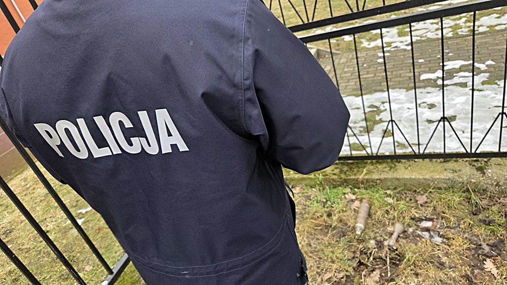 Funkcjonariusze pod nadzorem prokuratora zabezpieczają niebezpieczne znalezisko do czasu przyjazdu pirotechników w Olsztyna.