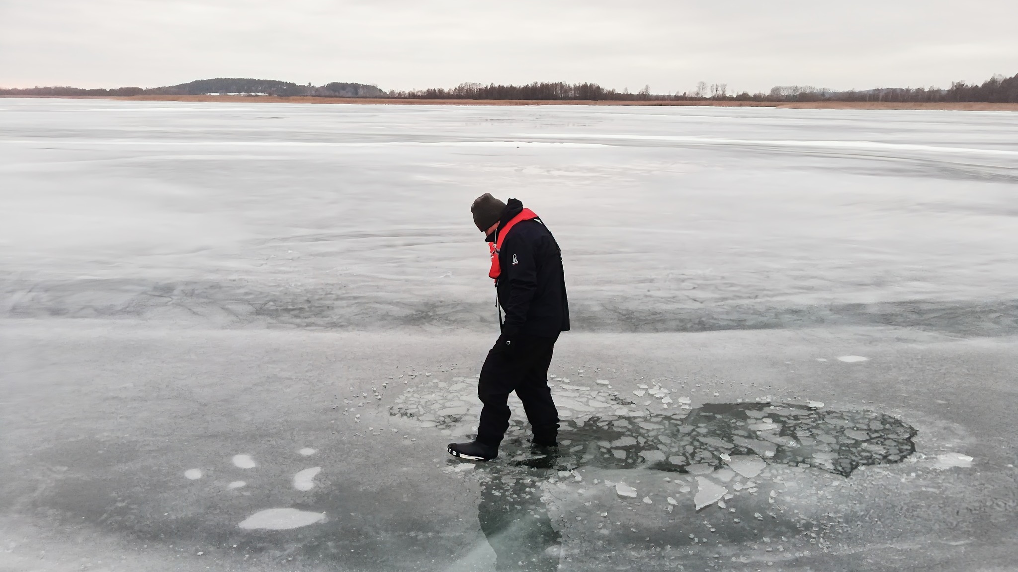 Na jeziorze Śniardwy szczególnym zagrożeniem jest miejscowe rozwarstwienie tafli, gdzie nad grubą warstwą lodu pojawiła się woda.